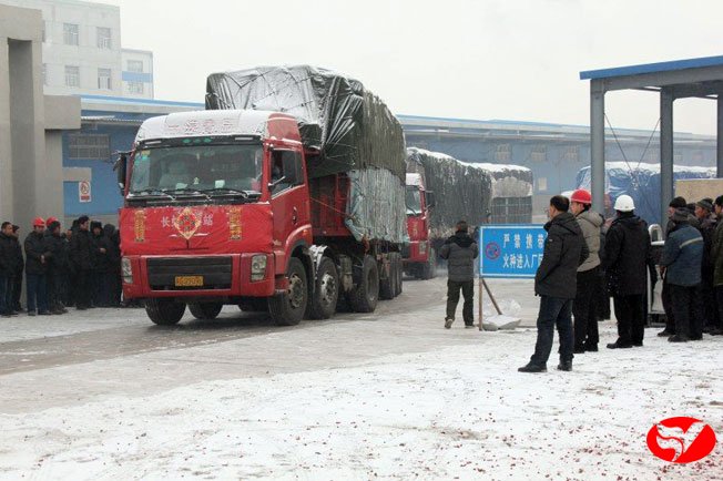 张正和总经理发表讲话,祝愿公司在新的年更加兴旺发达,各项事业马到成功,再创新佳绩。8:18分,在片欢庆的掌声和鞭炮声中,满载PVA的10辆卡车缓缓驶出西大门,在瑞雪中起航。