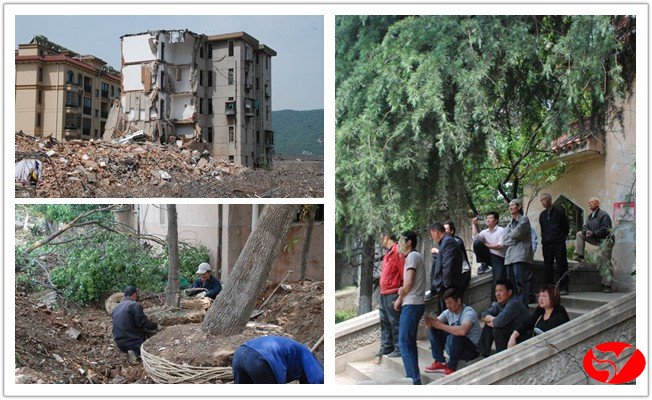 ? 昨日,在旧楼拆除现场,记者看到些职工携带相机正在拍照,据他们说,住了几十年,现在旧楼要拆除,总有些舍不得,拍下来留个纪念。记者还注意到,为了避免拆除中破坏生长几十年的树木,房地产公司专门对部分树木进行保护性拆除。